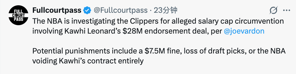 北京时间2月14日,据美记JoeVardon报道,NBA正在调查洛杉矶快船队,指控其涉嫌通过小卡一笔价值2800万美元的代言合同来规避工资帽。潜在的处罚包括:750万美元罚款、剥夺选秀权,或者NBA直接宣布伦纳德的合同完全无效。