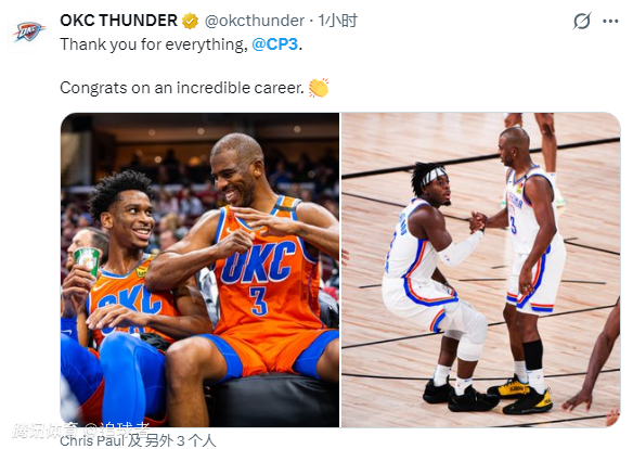 雷霆官方晒照写道:感谢你所做的一切,祝贺你拥有一个不可思议的职业生涯。