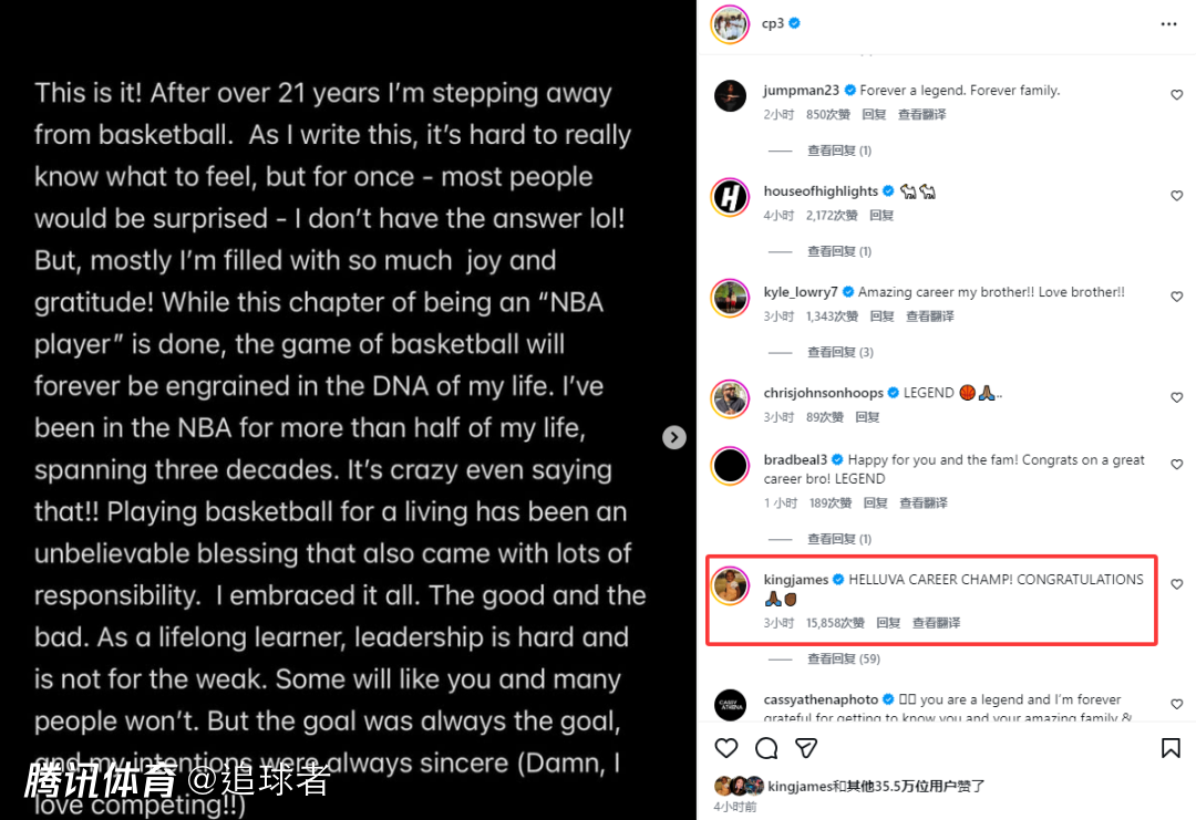 詹姆斯在保罗评论区致敬好兄弟,写道:非常了不起的职业生涯兄弟!祝贺你。