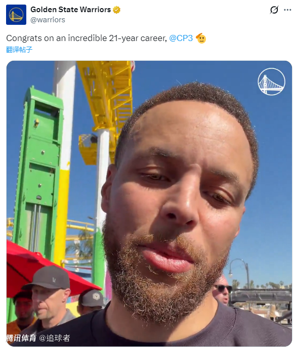 勇士官方引用库里的原话:恭喜你拥有一段无比辉煌的21年职业生涯,CP3!