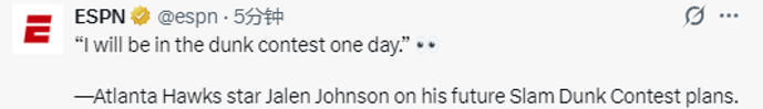 北京时间2月14日,老鹰队球员杰伦-约翰逊在观看NBA全明星名人赛时接受媒体采访,透露自己未来会出战扣篮大赛。