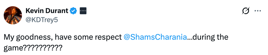 杜兰特在社媒写道:“我的天!对比赛能不能有点尊重。”并且艾特了Shams账号。