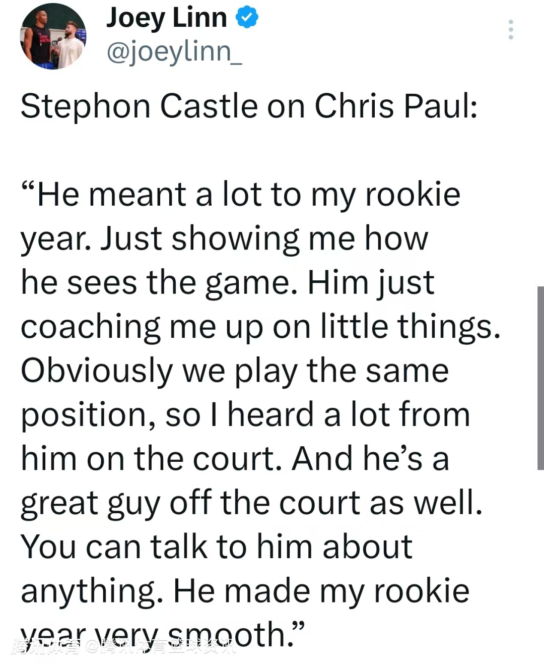 卡斯尔表示:“保罗对我的新秀赛季影响非常大,他教会我如何理解比赛,在很多细节上指点我。我们司职同一个位置,我在场上从他身上学到了很多。场下他也非常好相处,什么都能聊,是他让我的新秀赛季走得格外顺利。”