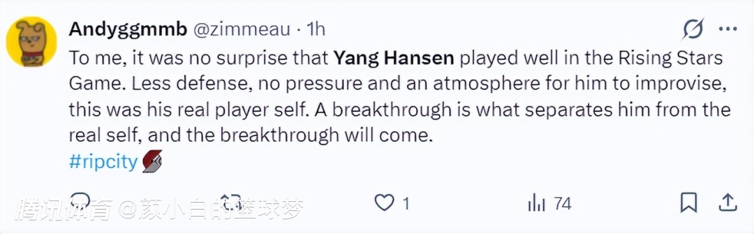 拓媒Ripcityy也发声祝贺杨瀚森在全明星赛起飞。