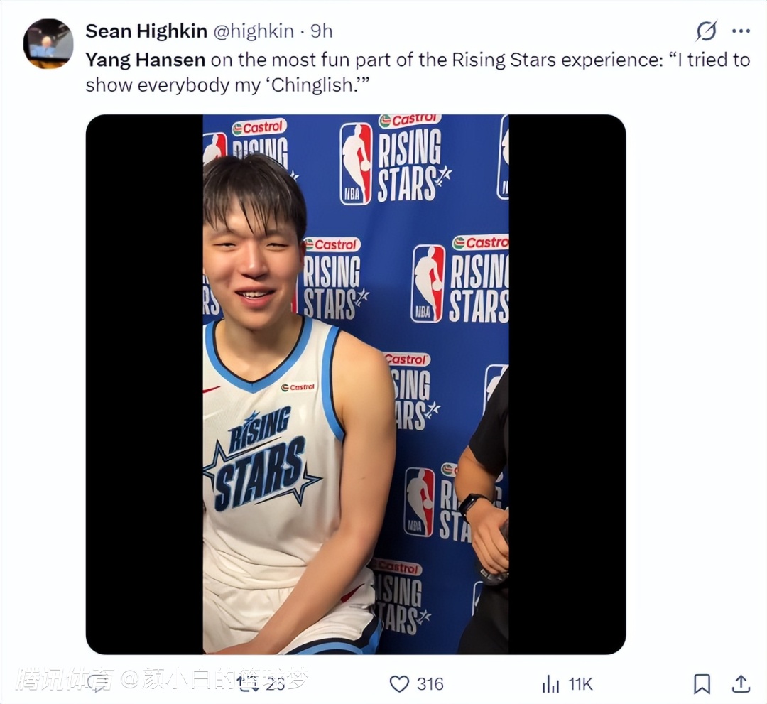 杨瀚森还谈到全明星新秀赛最有趣的部分是展现自己的‘中式英语’。