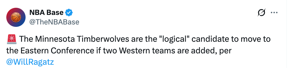 北京时间2月14日,据美记Will Ragatz报道,如果联盟新增两支西部球队,明尼苏达森林狼队将是“合乎逻辑”的、被移至东部联盟的候选球队。