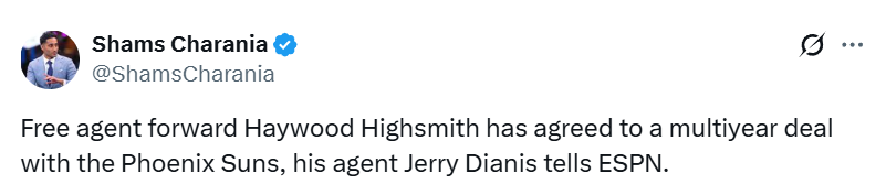 Shams表示,在海史密斯决定加盟太阳之前,多支季后赛球队都在追求他。过去一周,湖人与76人都与他传出绯闻。