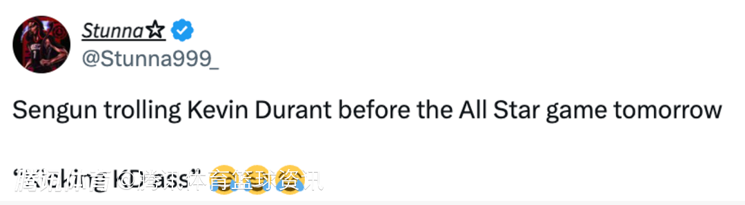 谈及明天全明星正赛自己最期待什么,申京打趣表示:“痛扁杜兰特。”(本次全明星申京代表世界队出战,杜兰特代表美国星条队出战)。