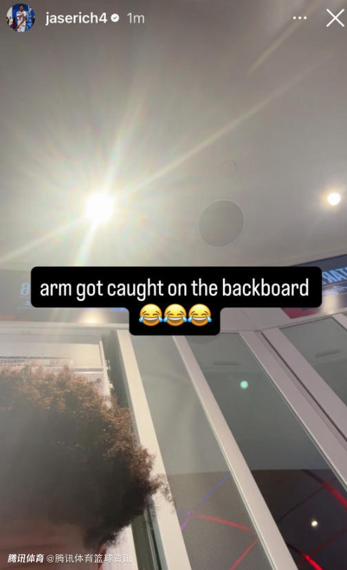 杰斯-理查德森写道:“我的胳膊被篮板卡住了。”他还配上了3个笑哭的表情,进行了自嘲。