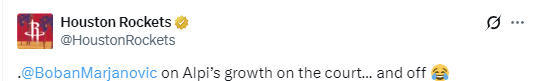 北京时间2月15日,火箭队官方晒出了前火箭队球员马扬诺维奇的采访视频,他谈到了自己前队友申京的进步,但调侃申京的英语还是太一般,仍需提高。