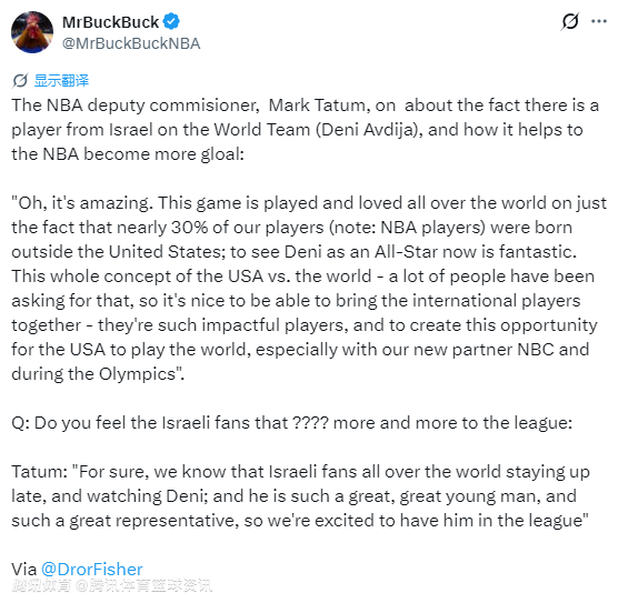 北京时间2月15日,NBA副总裁马克-塔图姆在接受采访时,谈及世界队中有以色列球员阿夫迪亚以及这如何推动NBA更加全球化。