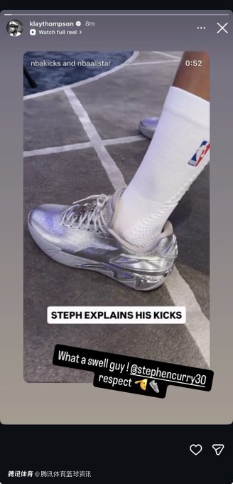 克莱转发了库里穿上纪念款战靴的照片,并附文写道:“真是个超棒的人!向库里致敬!”