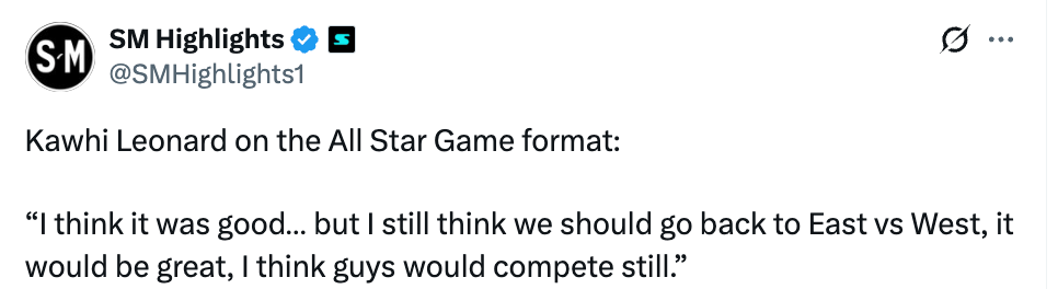 谈到全明星赛赛制,小卡表示:“我觉得现在的赛制还不错,但我还是觉得我们应该回归东西部对抗的形式,那样会很棒,我觉得球员们依然会全力竞争。”