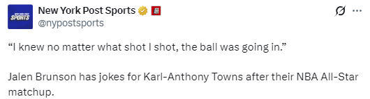 在谈到与队友唐斯进行对决的感受时,布伦森说道:“反正当我对位他的时候我就知道,不管我怎么投,球都能进,就是这么顺。”