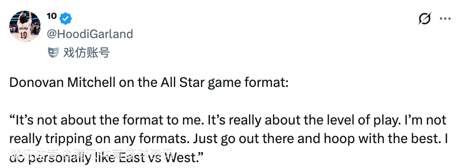 谈到全明星赛制,米切尔表示:“对我来说,关键不在于赛制,而在于比赛的强度。我对任何赛制都没什么意见,就是想上场和最顶尖的球员一起打球。不过我个人还是更喜欢东西部对抗的形式。”