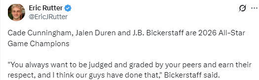 “能聚在一起真的太棒了,”比克斯塔夫赛后表示,“能和这些朝夕相处的伙伴们并肩,看着他们凭借自己的努力得到认可与瞩目。走到这一步并不容易,能坐在他们身边,见证他们收获来自同行、联盟的尊重,看到他们与其他球星同场竞技的样子,这一切都格外特别。你永远希望能得到同行的认可与尊重,而我认为我们的球员们做到了这一点。”