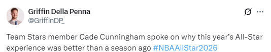 北京时间2月16日,NBA全明星赛落幕,美国星辰队47-21击败美国条纹队获胜。赛后,活塞队球员坎宁安接受媒体采访。