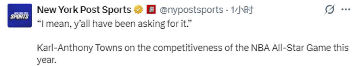 在谈到这次全明星赛的感受时,唐斯说道:“我觉得今天过后,大家都能看出来我们有多拼,我们每个人都拿出了全部努力,也希望所有球迷都能感受到这份用心。”