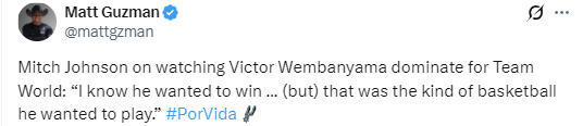 在谈到文班亚马代表世界队所打出的表现时,米奇-约翰逊说道:“我知道他很想赢,而这也正是他想要打出的篮球风格。”