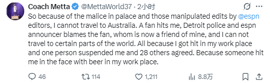 慈世平写道:“由于奥本山宫殿事件,以及ESPN编辑们那些刻意剪辑的片段,我现在无法前往澳大利亚。一名球迷打了我,底特律警方和ESPN解说当时都判定是那位球迷的责任,他现在已经成了我的朋友。可我还是被禁止前往世界上某些地区。这一切仅仅是因为,我在工作场所被人打了,结果一个人做出禁赛处罚,另外28个人附和同意。就因为有人在我的工作场合,用啤酒泼到了我的脸上。”