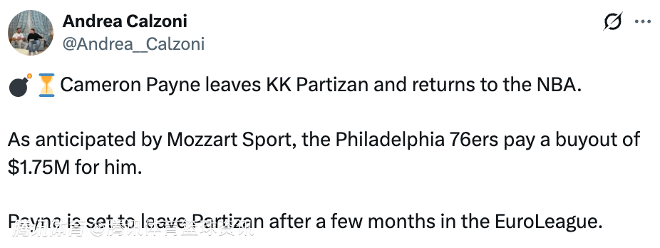 北京时间2月16日,据塞尔维亚媒体Meridian sport报道,卡梅隆-佩恩将重返NBA,和76人签约,塞尔维亚篮球俱乐部贝尔格莱德游击获得175万美元的补偿金。