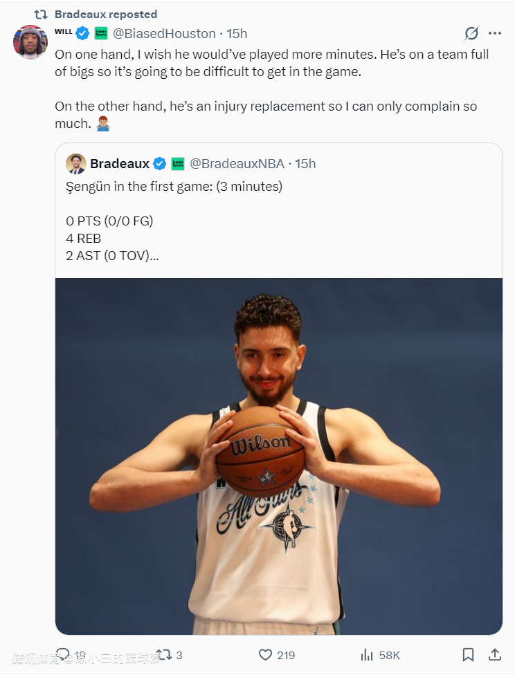 休媒Will发声:一方面我希望他能上更多的场次。他所在的球队中有多位内线球员,所以他要进入主力轮换会很困难。另一方面他只是替补球员,所以我只能抱怨他的戏份太少。