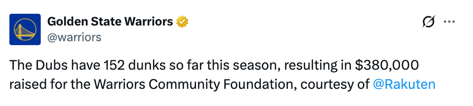 勇士和赞助商乐天合作了一项长期的公益项目,这个项目的名称就叫做“扣篮捐款”,勇士队每在比赛中完成一次扣篮,乐天就会向勇士社区基金会捐赠2500美元。这些资金主要用于支持湾区的教育、青年发展及社区建设项目。