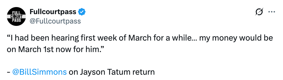 西蒙斯在节目中对塔图姆的复出时间进行了一个预测:“我之前一直听说他会在三月第一周复出,现在我赌他会在3月1日回归。”