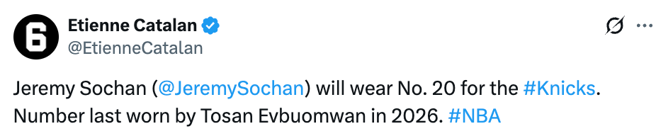 此前在马刺效力期间,索汉一直选择10号,不过尼克斯的10号球衣已经被退役(沃尔特-弗雷泽)。
