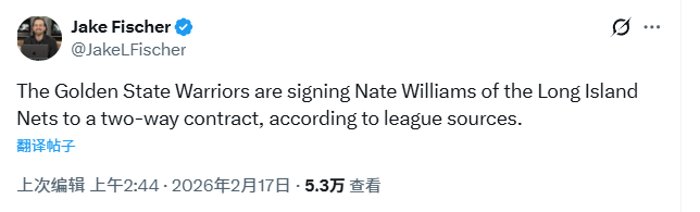 北京时间2月17日,据NBA名记Fischer报道,勇士将与内特-威廉姆斯签下一份双向合同。