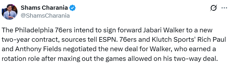 北京时间2月17日,据名记Shams报道,76人将与前锋贾巴里-沃克签下一份两年正式合同。
