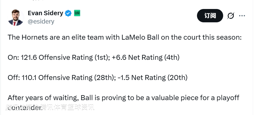 北京时间2月17日,根据记者Evan Sidery的报道,数据统计显示,本赛季当拉梅洛-鲍尔在场时,黄蜂是一支顶级强队。