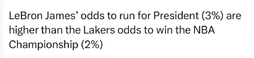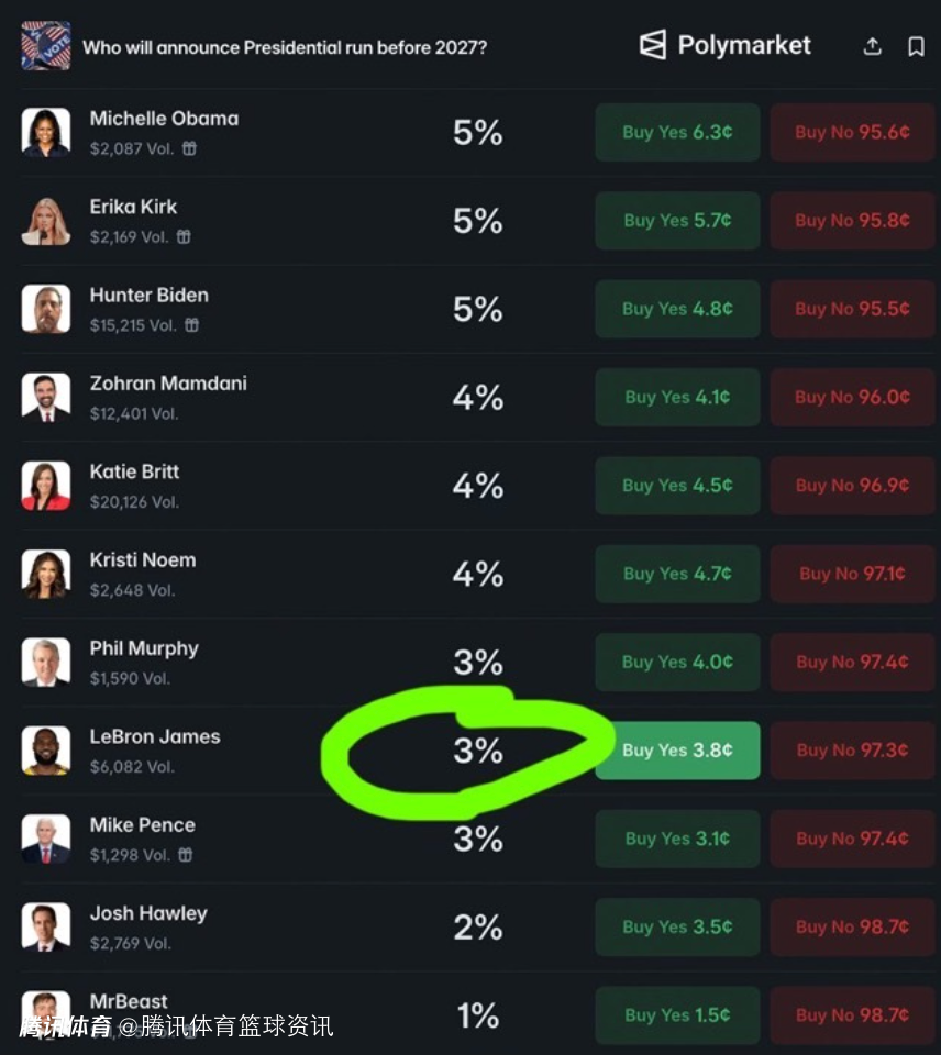 北京时间2月17日,近期,Polymarket账号发布了一个有趣的预测概率,詹姆斯赢得美国总统的概率为3%,高于湖人获得总冠军的概率2%。