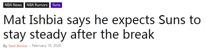 北京时间2月17日,鉴于太阳队目前以理想状态进入全明星间歇期,球队老板马特-伊什比亚在接受采访时表示,球队下半程不追求花哨操作,只需要稳定。