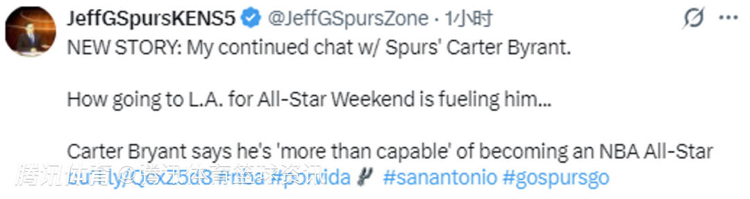 北京时间2月17日,马刺队球员卡特-布莱恩特接受采访,谈到了第一次参加全明星周末、输掉扣篮大赛的感受。