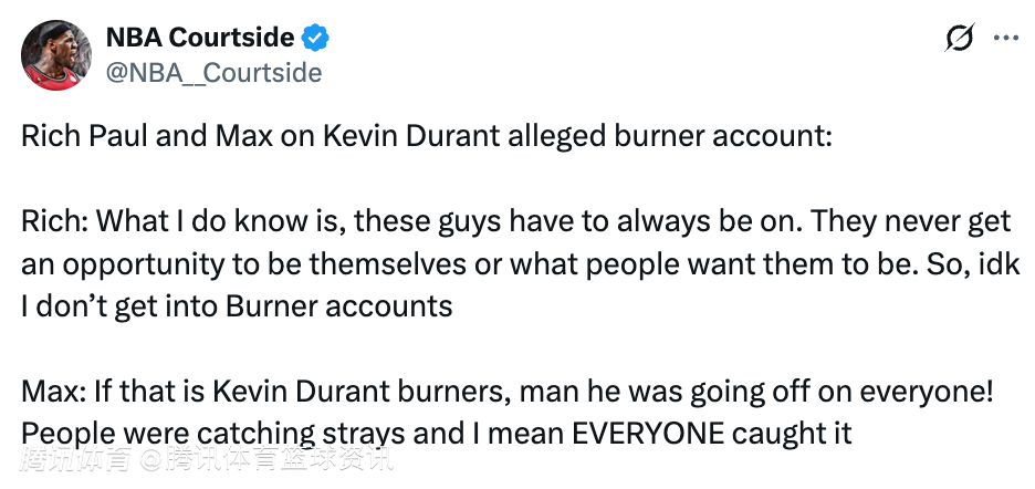 马克斯则是表示:“如果那些小号真是杜兰特的,那他可真是火力全开,怼遍了所有人!大家都被他无差别攻击到了,我是说,所有人都没能幸免。”