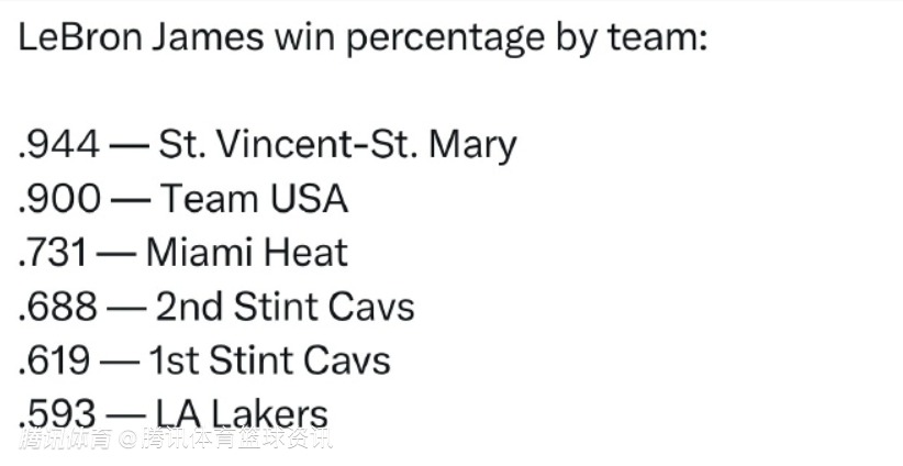 北京时间2月17日,美媒盘点了詹姆斯生涯不同时期的比赛胜率,其中圣文森特圣玛丽高中的胜率最高,湖人生涯的胜率最低。