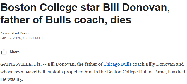 北京时间2月17日,芝加哥公牛队主教练比利-多诺万的父亲比尔-多诺万逝世,享年85岁。比尔-多诺万在篮球领域成就斐然,曾入选波士顿学院篮球名人堂。