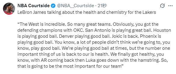 詹姆斯说道:“西部竞争太激烈了,有太多强队。很明显,还有卫冕冠军雷霆。马刺打得非常出色,火箭状态不错,掘金也打得很好,约基奇已经回归。太阳同样表现不俗。”