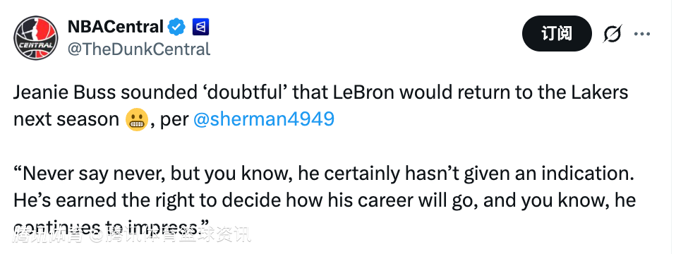 北京时间2月18日,据美记Alex Sherman报道,珍妮-巴斯对詹姆斯下赛季是否会重返湖人持“怀疑态度”。