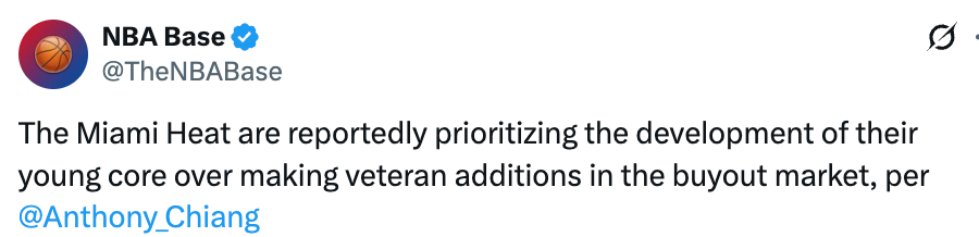 北京时间2月18日,据热火队记Anthony Chiang报道,迈阿密热火目前更优先培养球队的年轻核心,而不是在买断市场上引进老将。