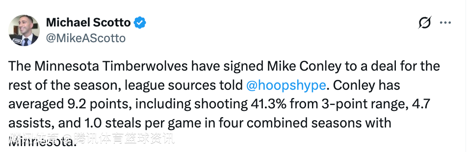本赛季,康利为森林狼出战44场比赛,场均出战18.4分钟,得到4.4分1.8篮板2.9助攻,三项命中率分别为32.2%、32.1%和89.1%。此前森林狼球星爱德华兹在接受采访时,就曾表示希望康利可以重返明尼苏达。