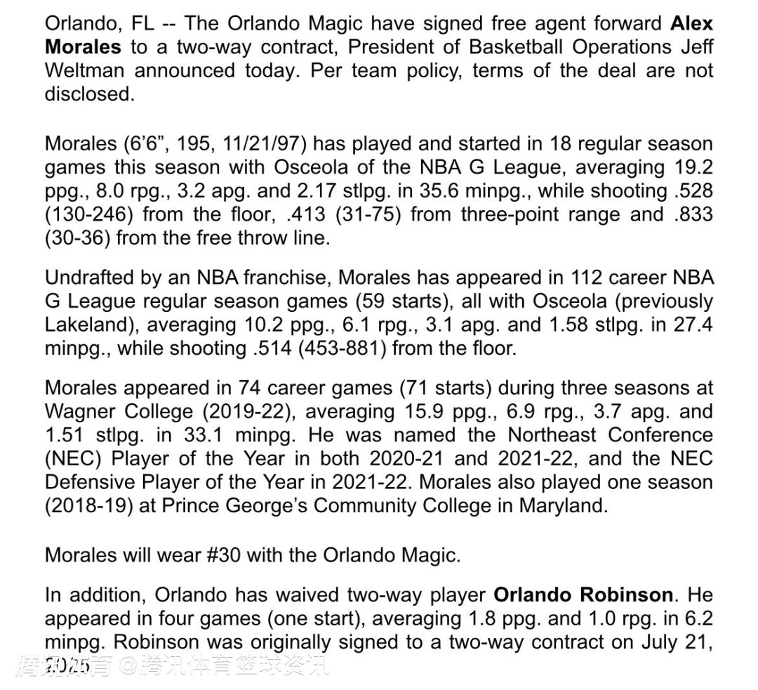 未来几周莫拉莱斯能在NBA获得多少出场机会仍未可知,但魔术用一份生涯首份双向合同奖励他本赛季的表现。他最多可为魔术出战16场常规赛。