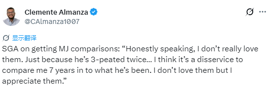 亚历山大:说实话,如果我说不觉得这是一种荣幸,那肯定是在撒谎。能和篮球这项运动的门面人物相提并论,真的太不可思议了。但老实讲,我其实不太喜欢这些比较。