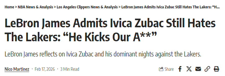 北京时间2月18日,湖人球星詹姆斯在播客节目中谈到祖巴茨每次碰到湖人都会给球队制造巨大麻烦。