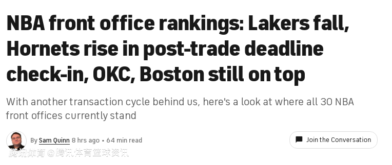 北京时间2月18日,美国媒体CBS公布NBA30支球队管理层排名。雷霆高居榜首,凯尔特人紧随其后,湖人排在第25位,国王位列倒数第一。