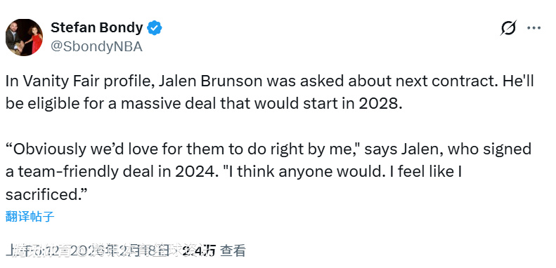2024年,布伦森以4年1.565亿美元提前续约,远低于他能拿到的顶薪。而2028年,他将有资格签下一份5年4.178亿美元的超级合同。他坦言:“显然,我们希望球队能善待我。我想任何人都会这么期待。我觉得自己做出了牺牲。”