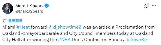 北京时间2月18日,迈阿密热火队前锋凯沙德-约翰逊在夺得扣篮大赛冠军后,于今日正式获得奥克兰市市长芭芭拉-李与奥克兰市政府颁发的官方表彰证书。