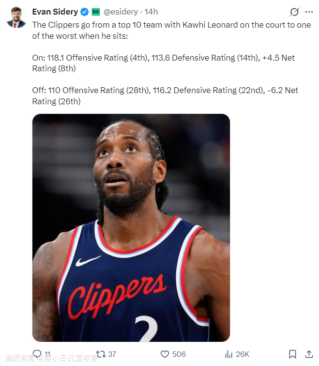 根据《福布斯体育》记者埃文-斯迪瑞最新的消息,本赛季的伦纳德算是独扛快船,卡哇伊在场时快船进攻效率118.1(联盟第四),不在场时进攻效率110(联盟28)。