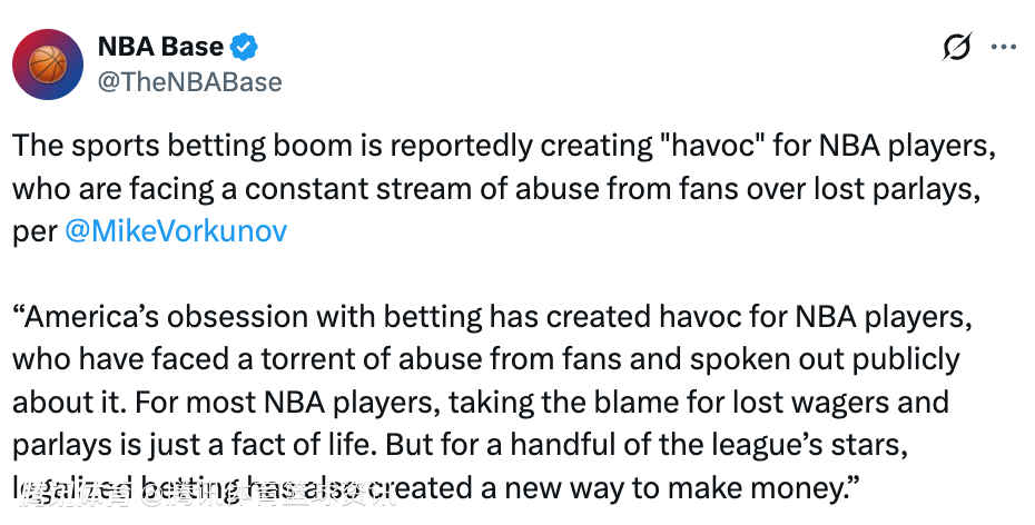 北京时间2月18日,据美记Mike Vorkunov报道,体育博彩的热潮正在给NBA球员造成 “严重混乱”,他们因球迷的串关投注失利而不断遭受辱骂。